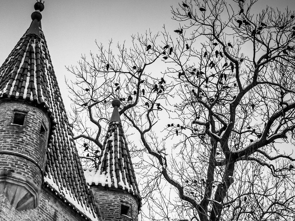 Schwarz-Weiß Fotografie eines Turms mit Baum, Raben und starker Vignette. Mystisches Bild