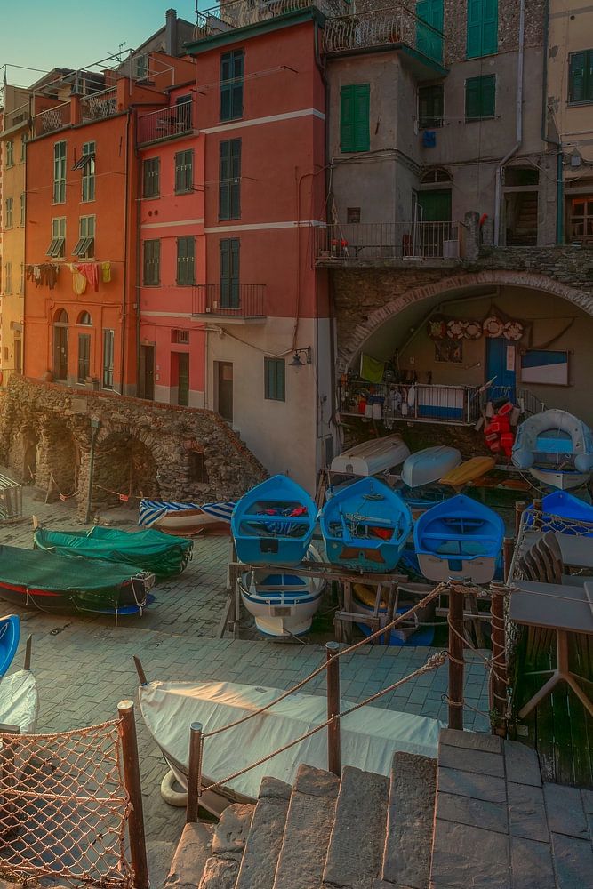 Blick unter einem Bogen von Booten im Fischerdorf Riomaggiore.