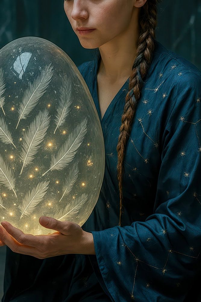 Ein Moment jenseits der Zeit: Eine junge Hüterin sitzt im Halbdunkel eines geheimnisvollen, kathedralenartigen Raums. Ihre Haltung ist ruhig, fast rituell. Die langen, kunstvoll geflochtenen Haare umrahmen ein stilles, ernstes Gesicht, das den Blick nach innen richtet. Ihre Hände umschließen ein leuchtendes, übergroßes Ei – durchsichtig, von innen heraus strahlend, durchzogen von feinen, silbrig-weißen Federmustern und winzigen Lichtpunkten wie Sternenstaub.