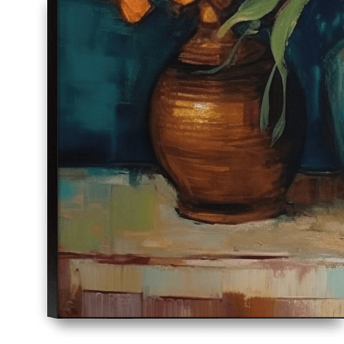 Bestelle dieses Stilleben Das Flammengeflüster | Stillleben mit Rostorange, Teal und Goldrute. von Blickfänger Gemälde als Reproduktion auf Leinwand, Alu-Dibond, als Poster, Fototapete oder Acrylglasbild.