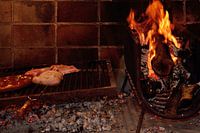 Ein perfekt zubereitetes Abendessen zu Hause, organisiert von unseren Freunden in Punta del Este, Uruguay. Das Fleisch wird langsam in der Parilla fertig.