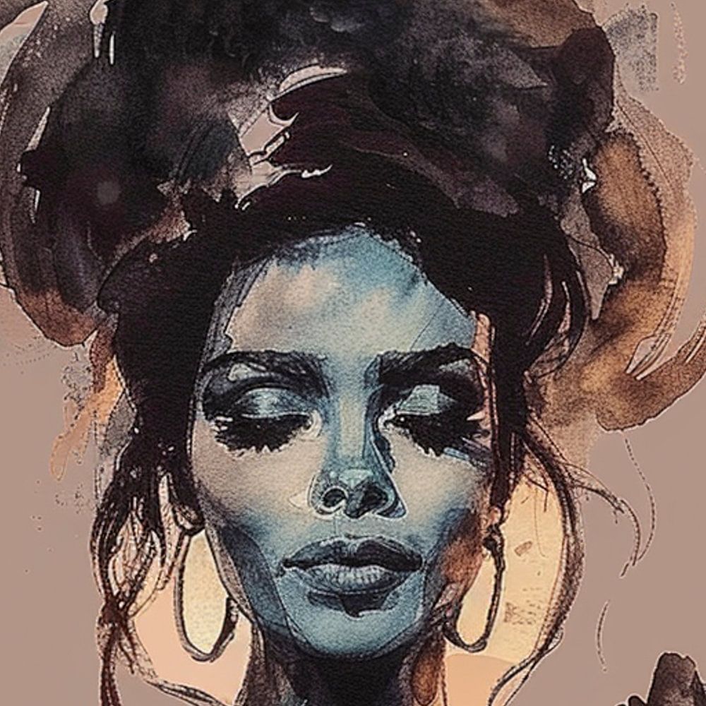 Das Gesicht des Porträtierten ist bedeckt, was eine geheimnisvolle Anziehungskraft ausübt, die zu einer tieferen Betrachtung einlädt. Satte Braun- und Schwarztöne mischen sich mit sanften Blautönen und ergeben ein visuelles Spektakel, das sowohl fasziniert als auch verzaubert.