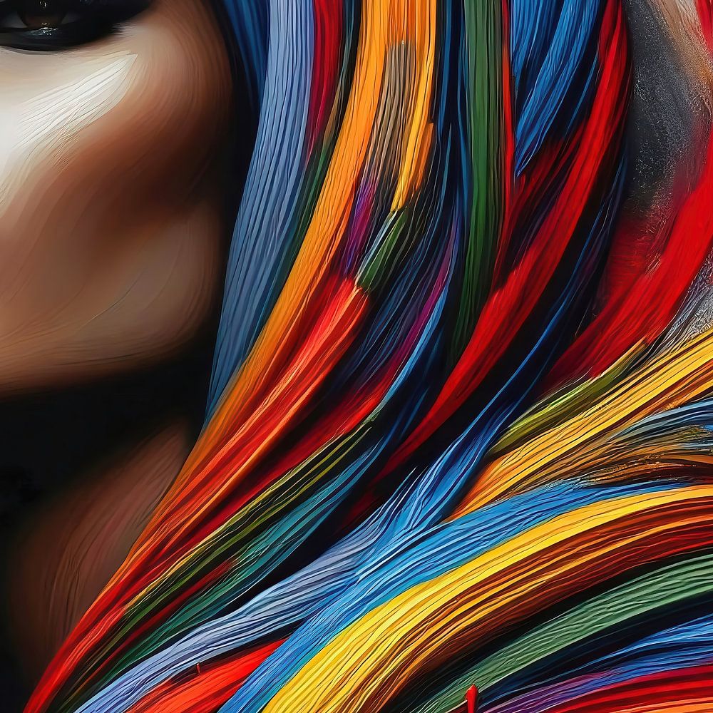 Ein kraftvolles Porträt einer Frau, die sich in eine Explosion von Farben hüllt. Der hyperrealistische Gesichtsausdruck kontrastiert mit den abstrakten, ausdrucksstarken Pinselstrichen ihres Kopfschmucks, als ob sich Gefühle und Identität in Farbe und Bewegung entladen würden. Das Werk strahlt Stärke, Stolz und Geheimnis aus - eine Ode an weibliches Selbstbewusstsein und innere Tiefe.