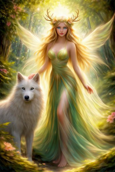 In diesem handgefertigten digitalen Kunstwerk steht eine Deva im Mittelpunkt eines üppigen Waldes, umgeben von zartroten Blumen und sonnenverwöhnter Vegetation. Ihre azurblauen Augen strahlen Klarheit und innere Stärke aus, während ein transparentes grünes Kleid ihre Verbundenheit mit der Natur unterstreicht.