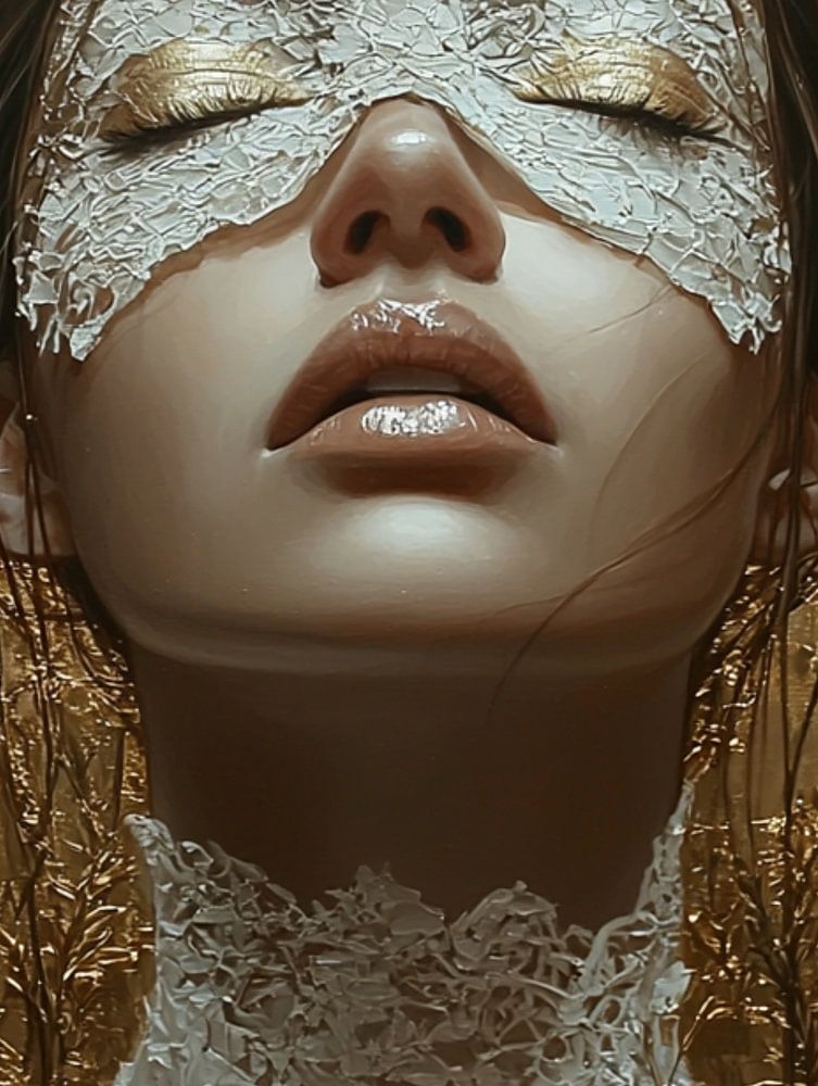 Ein faszinierendes Gemälde zeigt das Gesicht einer Frau, das teilweise in Gold- und Weißeffekten verschwindet. Ihr heiteres Gesicht ist teilweise hinter einer weißen Spitzenmaske verborgen, die ein Gefühl von Geheimnis und Macht hervorruft.