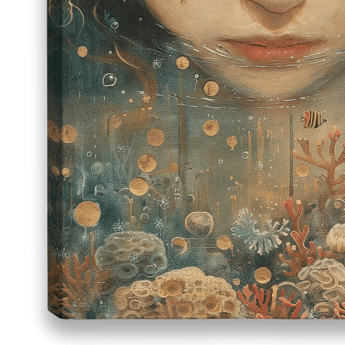 Das Bild mit dem Titel "Whispers of the Ocean" zeigt ein junges Mädchen, das in die Wunder des Meeres eingetaucht ist und dessen Haare und Gedanken mit dem Reichtum des Meereslebens verwoben sind. Die Vielzahl von Farben und Mustern, die ihre Krone bilden, spricht von der reichen Artenvielfalt und der zarten Verbindung, die wir Menschen…