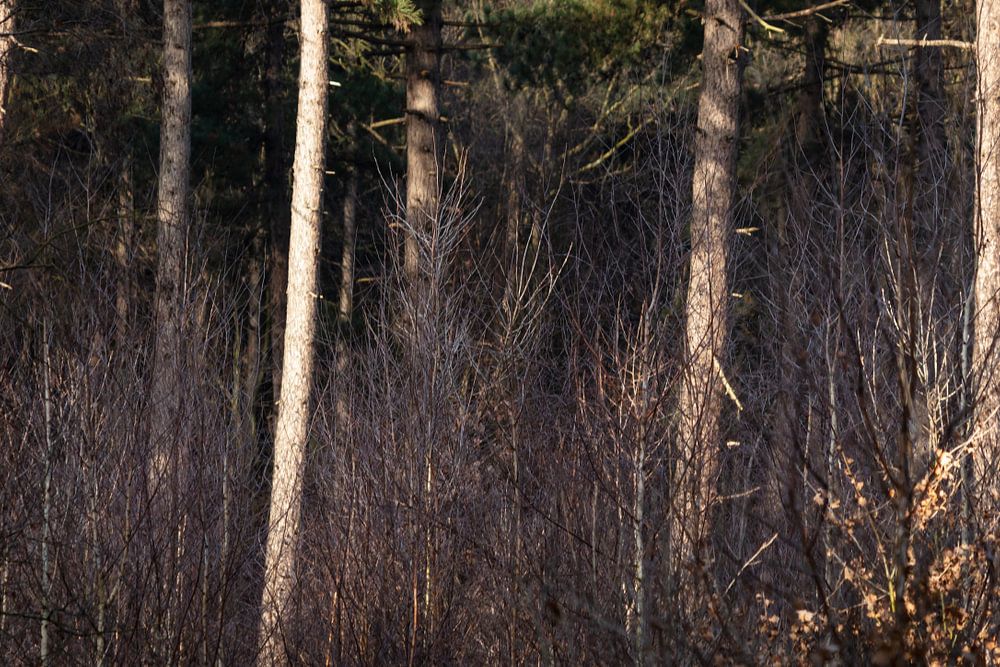 Waldgebiet im Winterlicht... Blicke zwischen Bäumen und die Schatten anderer Bäume. Reflektionen des Sonnenlichts auf anderen Bäumen