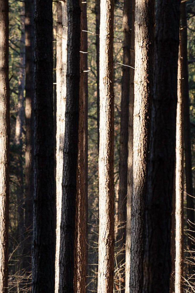 Waldgebiet im Winterlicht... Blicke zwischen Bäumen und die Schatten anderer Bäume. Reflektionen des Sonnenlichts auf anderen Bäumen