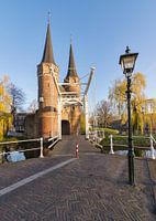 Stadttor De Oostpoort in Delft während der goldenen Stunde. Die Türme sehen im goldenen Morgenlicht wunderschön aus.