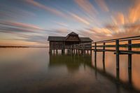 Das bekannte Holzhütte am Ammersee bei Sonnenuntergang. Aufgenommen in einer 3-minütigen Belichtung.