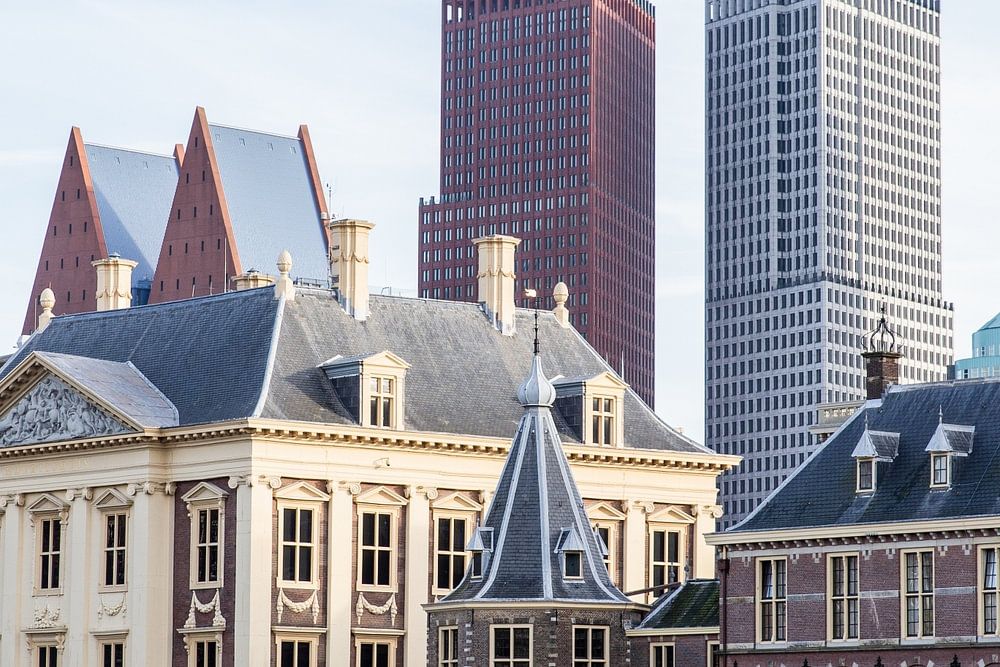 im Vordergrund das Zimmer des Premierministers und im Hintergrund das Hochhaus von Den Haag. Im Vordergrund sehen Sie schöne, verschnörkelte Altbauten des 2.