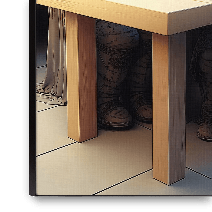 Eine ruhige, eindringliche Meditation über Erinnerung, Einheit und kosmisches Erbe. „Das Jahr beinhaltet fast“ zeigt zwei rätselhafte Figuren - eine gesichtslos, die andere alterslos -, die um einen Holztisch versammelt sind. Zwischen ihnen ruht eine zerbrochene Kugel, ein Symbol für zerbrechliche Zeit oder gemeinsamen Ursprung. Hinter…