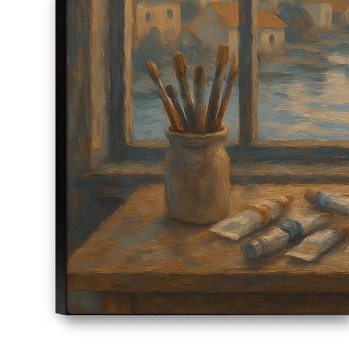Auf der hölzernen Arbeitsplatte liegen Pinsel, Farben und eine unfertige Leinwand: eine Momentaufnahme der Schöpfung selbst. Das Gemälde erzählt nicht nur von dem, was außen sichtbar ist, sondern auch von dem, was im Inneren des Künstlers vor sich geht. Es ist eine Ode an die Gelassenheit des Handwerks, an das Sehen, Fühlen und Einfangen des Lichts.