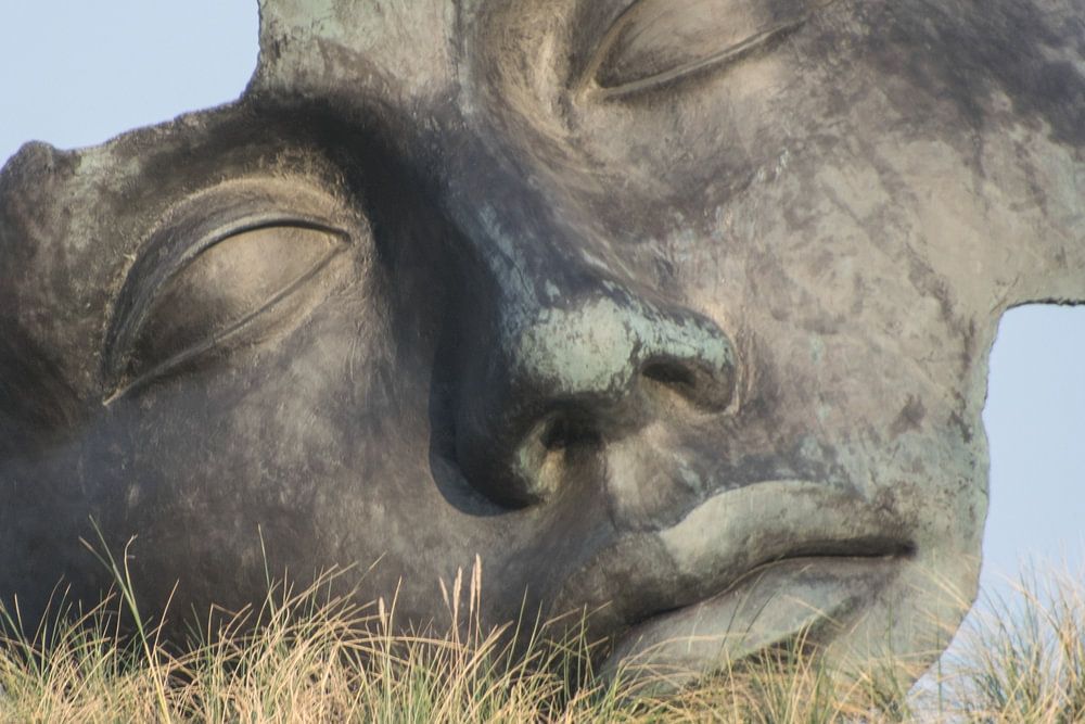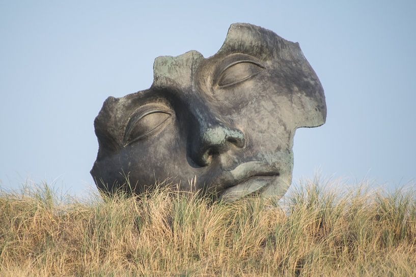 Die mannshohe Bronzemaske auf der Düne in Scheveningen von Igor Mitoraj. Skulpturen am Meer