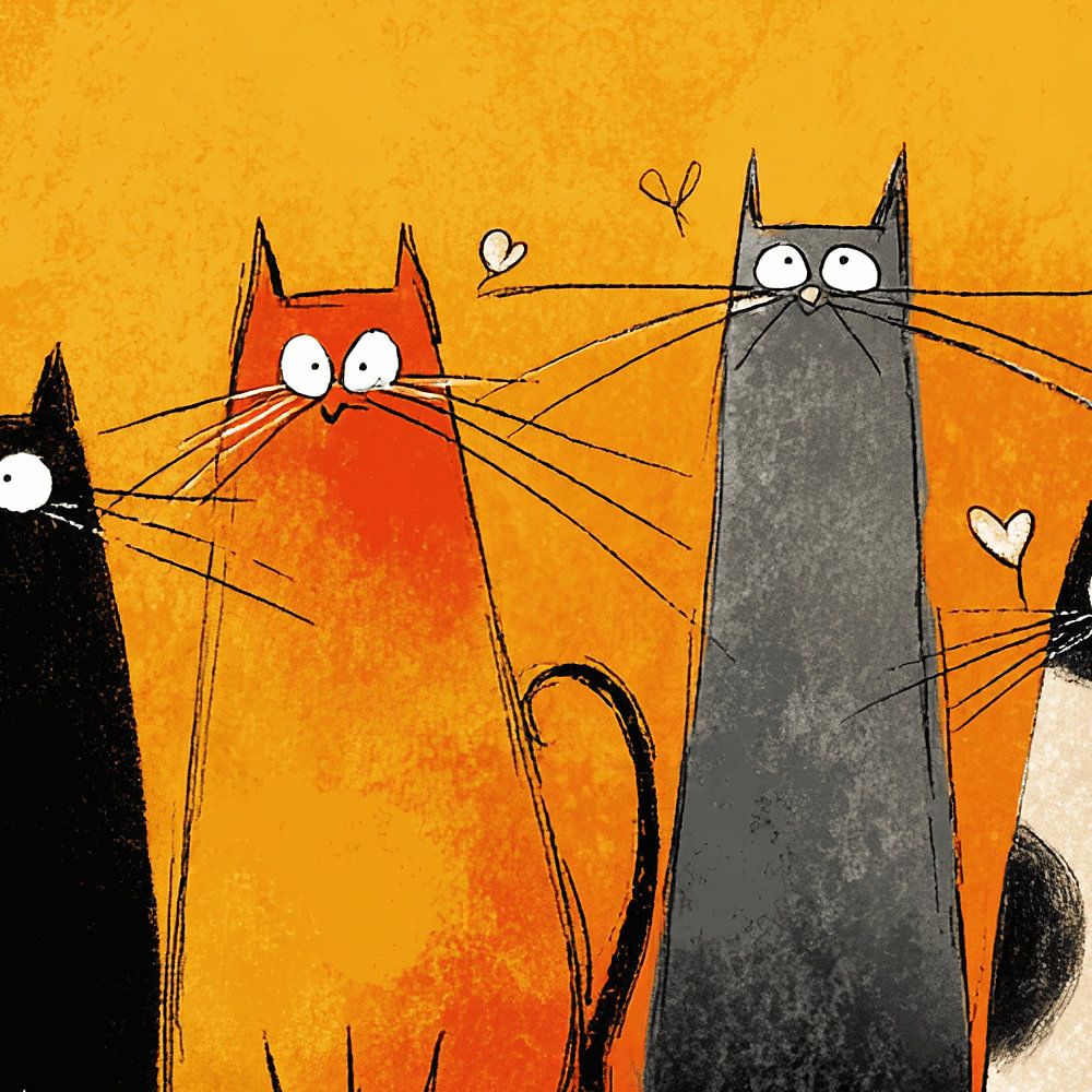 Diese Serie von Kunstwerken zeigt abstrakte und ausdrucksstarke Katzen, jeweils in Gruppen. Die Katzen sind stilisiert und farbenfroh dargestellt, mit ausgeprägten Formen, langen Körpern und verspieltem Gesichtsausdruck.