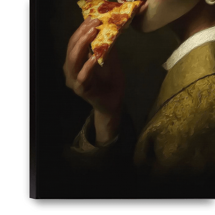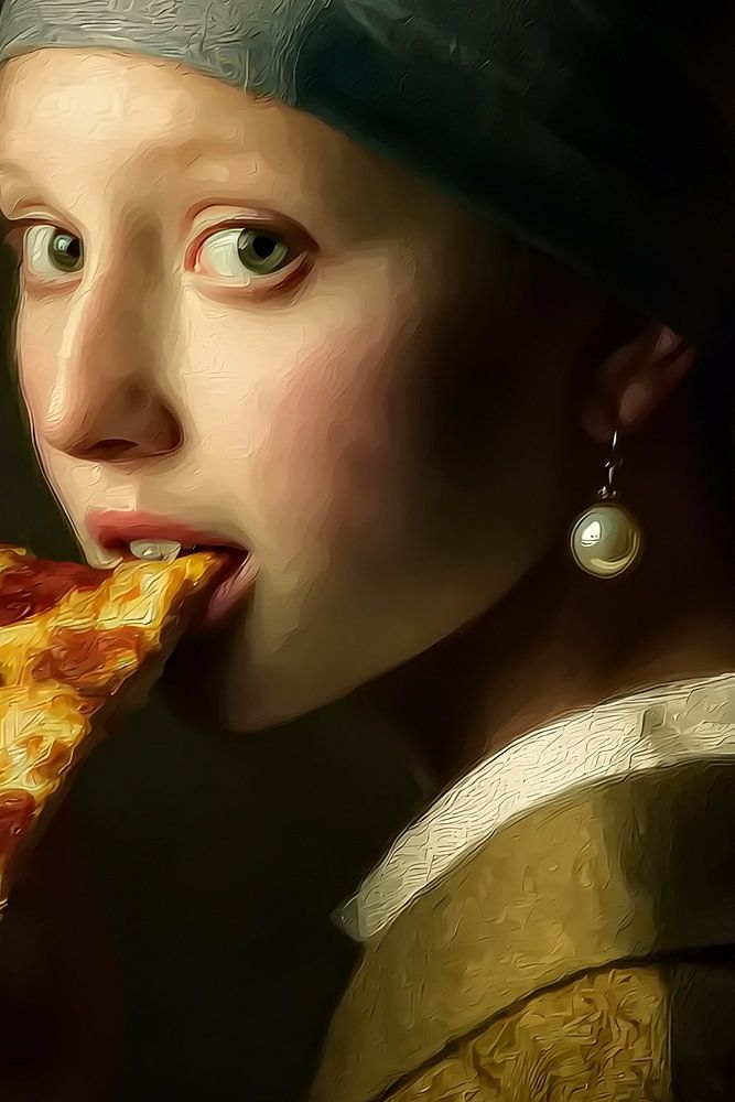 Ein klassisch anmutendes Porträt zeigt eine junge Frau mit Kopftuch und Perlenohrring, die über die Schulter blickt, während sie ein Stück Pizza isst. Die malerische Lichtführung erinnert an alte Meister, doch das moderne Motiv bricht die historische Ästhetik bewusst. Der Kontrast zwischen zeitloser Eleganz und alltäglicher Geste…