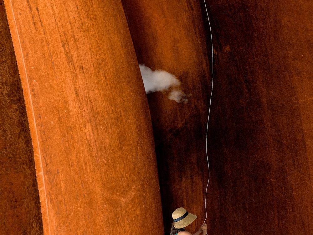 "Das Mädchen und die Wolke" zeigt einen stillen Moment in einer entfremdeten Landschaft. Ein junges Mädchen, klein und verletzlich, steht am Anfang eines monumentalen Labyrinths aus rostigen Stahlplatten, das als Werk von Richard Serra erkennbar ist. Die Platten erheben sich hoch über ihr, ihre rostige Haut erwärmt sich im diffusen Licht, und ihre runden Formen scheinen sie langsam zu umarmen oder vielleicht zu fangen.