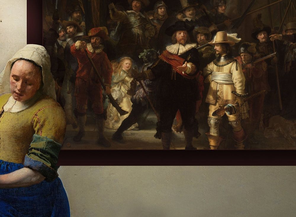 Zwei berühmte Gemälde, nämlich die Milchmagd von Joannes Vermeer und die Nachtwache von Rembrandt van Rijn, sind in diesem Werk vereint. Als Grundlage diente das Bild des Milchmädchens, das breiter und höher gemacht wurde. Keine leichte Aufgabe, denn der Fußboden und die darüber liegenden Fliesen ließen eine einfache Reproduktion nicht zu. Das ursprüngliche Stuck wurde entfernt, um die Aufmerksamkeit von der Milchmagd, die sich teilweise vor Rembrandts Meisterwerk befindet, auf die Nachtwache zu lenken. Über dem Tisch ist eine elektrische Hängelampe aufgehängt, die die Wand und das Milchmädchen in ein fahles Licht taucht. Die Kunst der alten Meister vereint durch einen zeitgenössischen Meister.