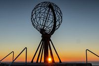 Die Weltkugel, das Nordkap-Denkmal während eines schönen Sonnenuntergangs.