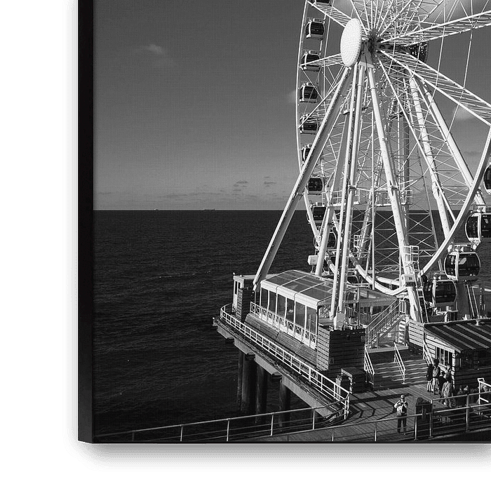 Das Riesenrad ist seit Jahren ein Wahrzeichen von Scheveningen, eine feste Form in einer sich ständig bewegenden Küstenlandschaft. Die Wahl von Schwarz und Weiß unterstreicht diesen festen Charakter: Ohne Farbe bleiben reine Form, Licht und Komposition. Der Kontrast zwischen dem hellen Himmel und den dunklen Konturen des Rades verstärkt den grafischen, fast architektonischen Charakter des Bildes.