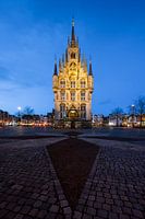 Eine Frontansicht des Rathauses von Gouda während der blauen Stunde. Das imposante Rathaus auf dem Marktplatz wurde 1448 erbaut und diente bis 2012 als Rathaus von Gouda.