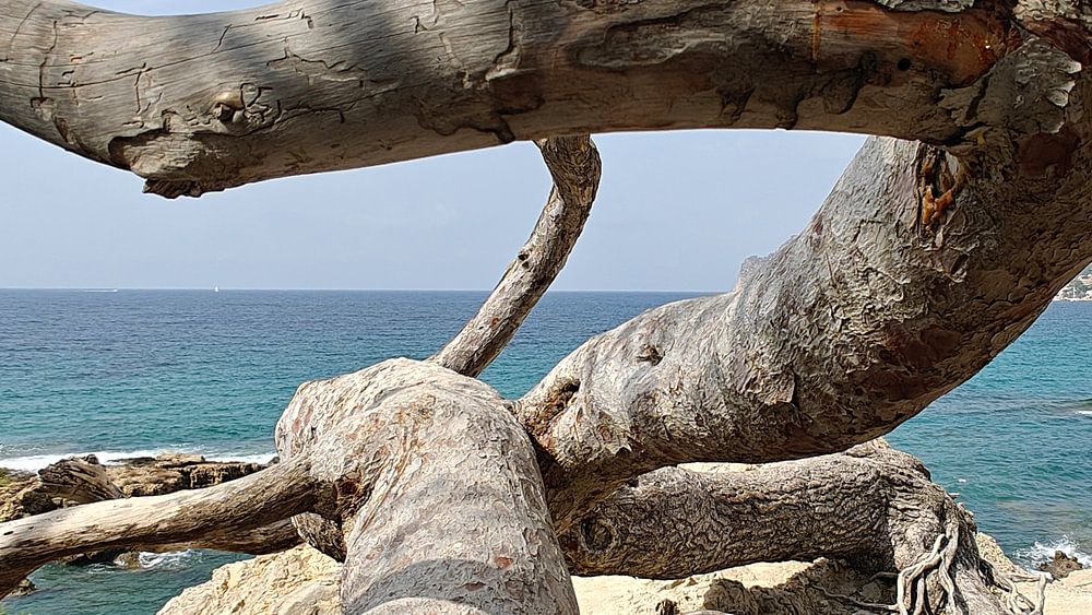 Das Skelett eines toten Baumes. Tote Äste. Fotos oder Bilder von Bäumen. Strand- oder Seeluft. Das verwitterte Skelett eines alten, toten, sonnengebleichten, verwitterten und umgestürzten Baumes.