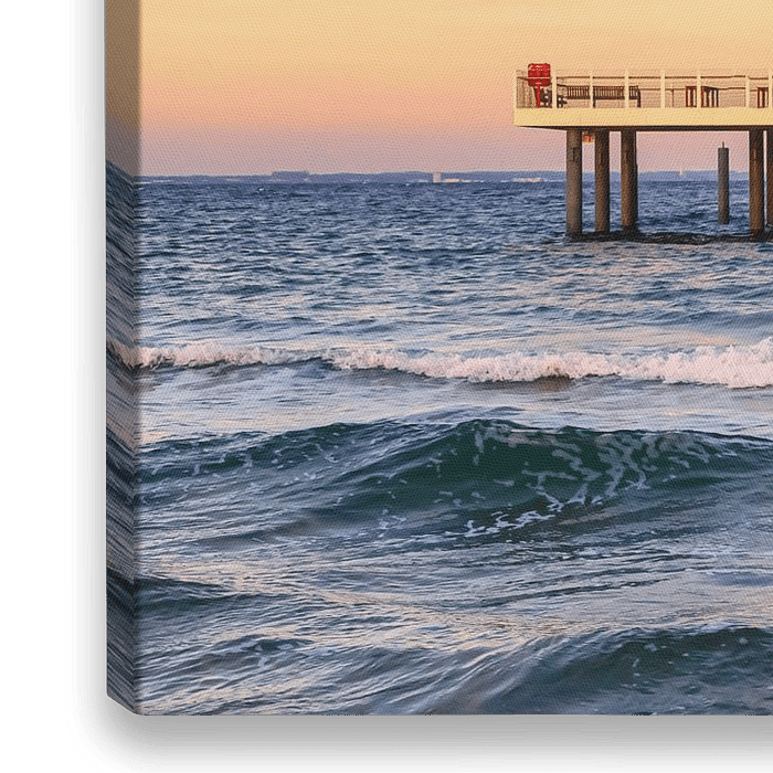 Japanisches Teehaus auf einer Seebrücke am Timmendorfer Strand bei zauberhaftem Licht über der Ostsee.