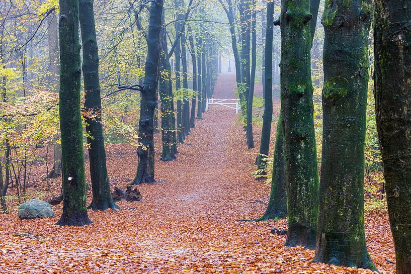 Dieses bezaubernde Herbstfoto entführt Sie ins Herz des Landguts De Oorsprong in Oosterbeek, einem Ort, an dem die Zeit für einen Moment stillzustehen scheint. Ein schmaler Pfad, vollständig bedeckt von einem warmen Teppich aus orangefarbenen und rotbraunen Blättern, führt den Blick tief in die Bildkomposition hinein, hin zu einem…