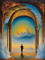 Die Zeit verblasst. Die Logik wird fließend. In diesem faszinierenden surrealistischen Gemälde entfaltet sich eine Landschaft, die sich den Gesetzen der Realität völlig entzieht. Eine endlose Ebene erstreckt sich bis zu einem undefinierbaren Horizont, an dem Himmel und Erde ineinander übergehen. In der Ferne schwebt eine Tür ohne Wand,…
