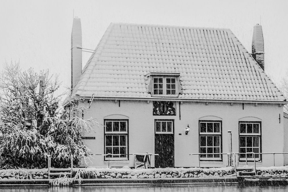 Am Rande des alten Dorfes Overschie steht das vielleicht meistfotografierte Haus von Rotterdam-Overschie. Das Fährhaus. Dieses Foto wurde am 10. Dezember 2017 während eines Winterregens aufgenommen.