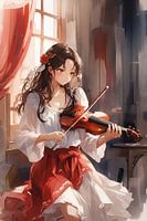 Digitale Zeichnung im Anime- und Aquarellstil eines Zigeunermädchens mit Geige.