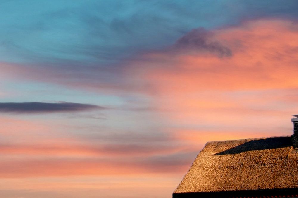 Das blaue, Reetdach gedeckte Haus, steht direkt am Strand mit Aussicht zum Meer.