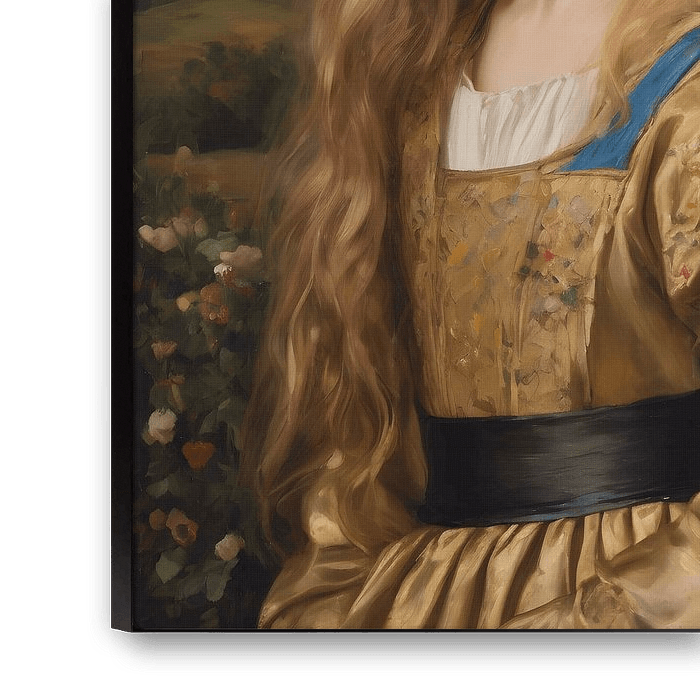 Ein meisterhaft gemaltes Porträt eines blonden Mädchens, das in der Pracht der Renaissance festgehalten wurde. Bewundern Sie die raffinierten Details der Blumengirlande, die ihren Kopf umgibt, ein Symbol für Jugend und Unschuld. Das von Helldunkel durchdrungene Gemälde fängt das subtile Spiel von Licht und Schatten auf eine Art und Weise ein, die an die großen Werke der Renaissancezeit erinnert.