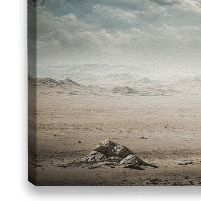 In einer endlosen, staubigen Wüstenlandschaft steht ein monumentales, augenförmiges Gebilde, das den Blick des Betrachters sofort auf sich zieht. Die Struktur, gefertigt aus einem verwitterten, hölzern wirkenden Material, besitzt ein inneres Geheimnis: Anstelle einer Pupille liegt ein rotierendes Universum, das spiralförmig leuchtet.…