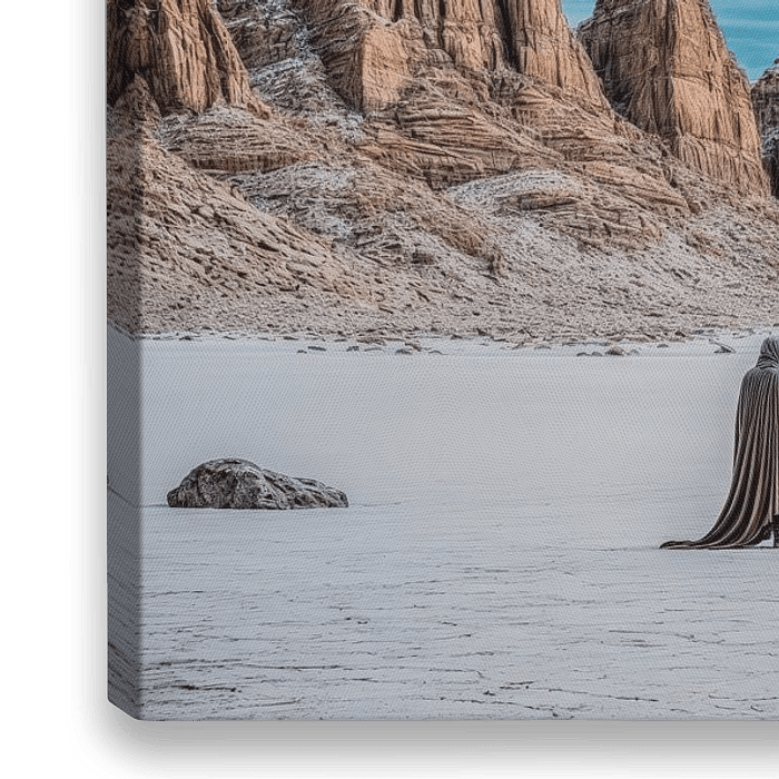 In einer kargen, schneebedeckten Landschaft erhebt sich ein gewaltiges, goldenes Objekt, das in seiner Form an eine überdimensionale Kelchschale erinnert. In ihrem Inneren rotiert eine majestätische Spirale, ein kosmisches Wirbelbild, das die unendliche Weite des Universums repräsentiert. Der Übergang von den warmen, metallischen Tönen…