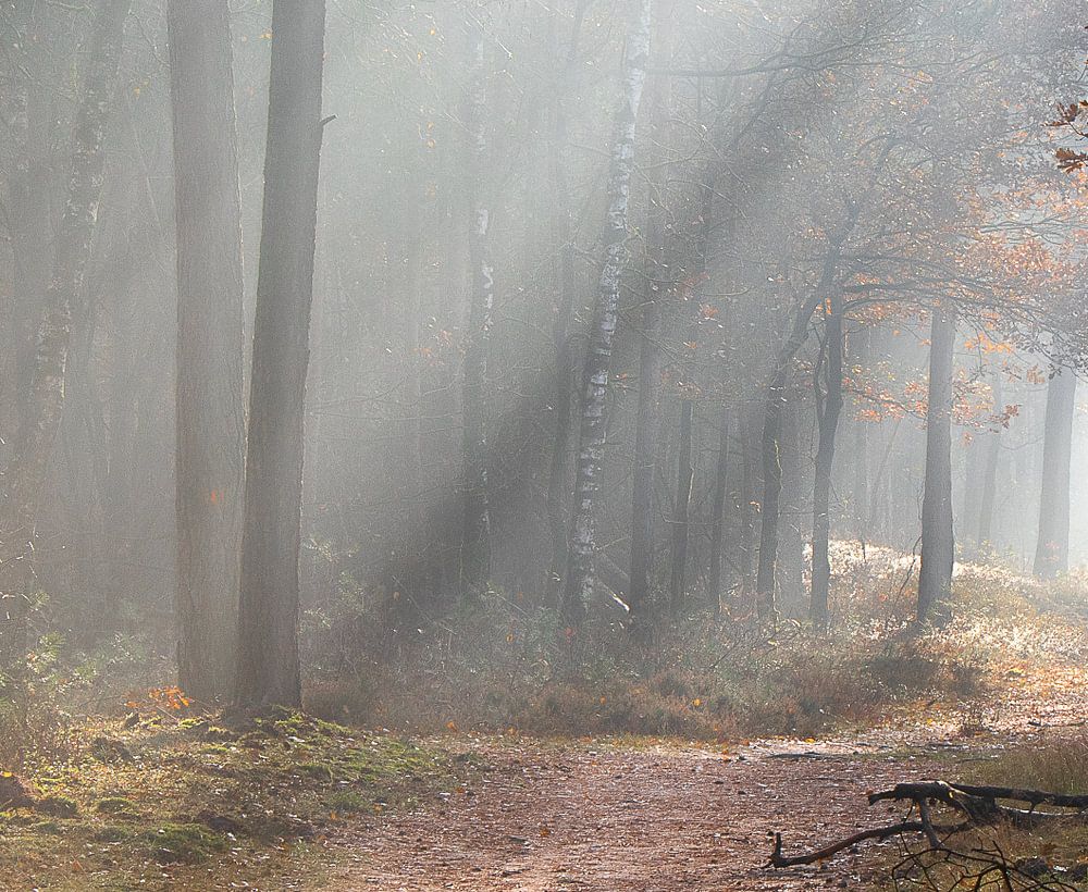 Eine Familie, die mit dem Hund früh morgens auf der Veluwe in den Niederlanden spazieren geht.