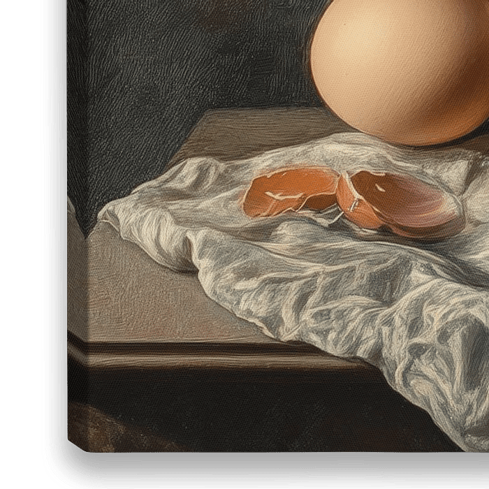 Dieses Stillleben präsentiert ein perfekt gebratenes Spiegelei, dessen leuchtend gelber Dotter im Zentrum des Arrangements steht und die Aufmerksamkeit des Betrachters auf sich zieht. Der Kontrast zwischen dem glänzenden Eigelb und dem leicht knusprigen Rand des Eiweißes verleiht dem Bild eine subtile Dynamik. Links daneben ruhen zwei…