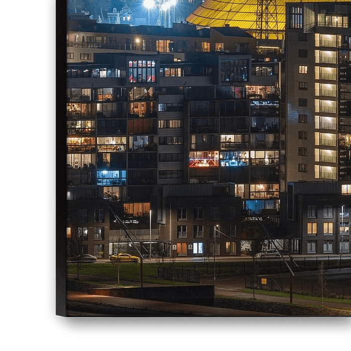 Das prächtige Feijenoord-Stadion De Kuip in Rotterdam mit seinen Lichtmasten. Dieses Foto zeigt den charakteristischen gelben Ring und die imposanten, bekannten Lichtmasten, die das Stadion wie Wächter überragen. Es ist eine Detailaufnahme des Stadions, in der das kräftige Farbenspiel und der industrielle Charakter des Bauwerks wunderbar zur Geltung kommen. Diese Bild ist Teil des fotografischen Kollektion von MS Fotografie. Klicken Sie rechts auf "Alle Bilder anschauen", um mehr Bilden aus der Kollektion zu sehen.