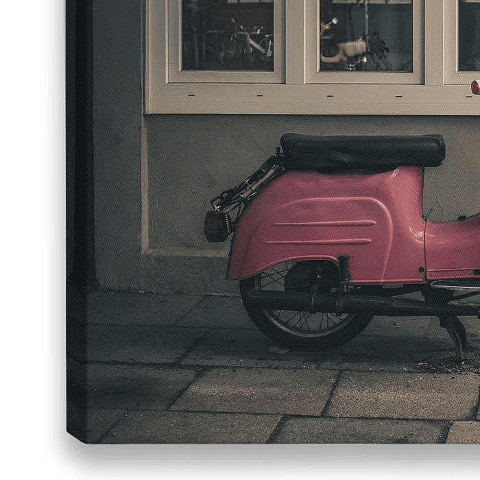 Bestelle das Foto Das rosa Moped von Jonas Röjestål als Reproduktion auf Leinwand, Alu-Dibond, als Poster, Fototapete oder Acrylglasbild.