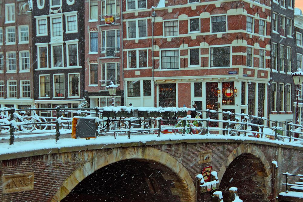 Schneebedecktes Amsterdam im Jordaan mit Sonnenuntergang in den Niederlanden