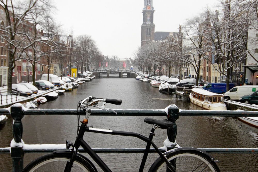 Das verschneite Amsterdam mit der Westerkerk in den Niederlanden
