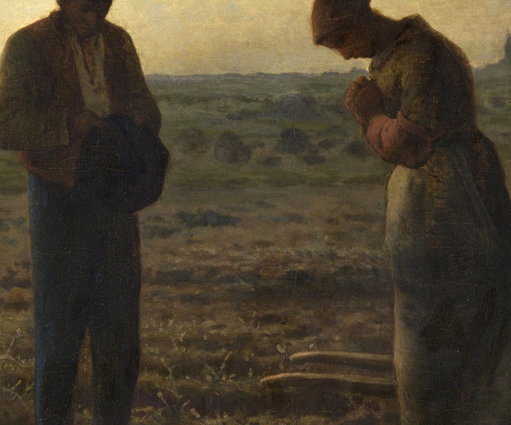 Ein Mann und eine Frau beten den Angelus, ein Gebet, das an die Ankündigung des Engels Gabriel an Maria erinnert. Sie haben aufgehört, Kartoffeln zu ernten, und alle Werkzeuge für diese Aufgabe - die Kartoffelgabel, der Korb, die Taschen und die Schubkarre - wurden um sie herum verstreut. Im Jahr 1865 sagte Millet: "Die Idee für den Angelus kam mir, weil ich mich daran erinnerte, dass meine Großmutter, die die Kirchenglocke läuten hörte, während wir auf dem Feld arbeiteten, uns immer dazu brachte, nicht mehr für das Angelus-Gebet zu arbeiten die Armen zu beten, die gestorben waren & quot; Es war also eine Kindheitserinnerung, die hinter dem Gemälde stand und nicht der Wunsch, ein religiöses Gefühl zu verherrlichen; Er war kein Kirchgänger außer Millet. Er wollte die unveränderlichen Rhythmen des Farmlebens in einer einfachen Szene festhalten. Hier konzentrierte er sich auf eine kurze Pause, einen Moment der Ruhe.