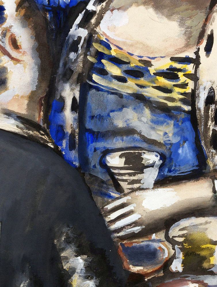 La Patronne, Diese starke Frau ist die Chefin im Haus. Der Mann ist auf dem Gemälde deutlicher niedriger dargestellt als sie.