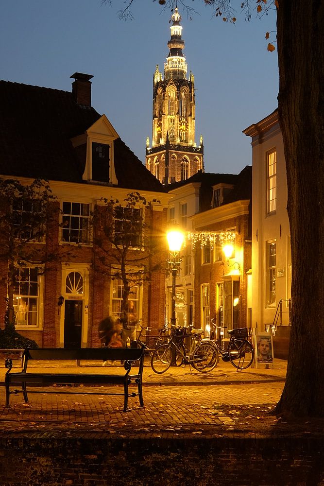 De nieuw verlichte Lange Jan in Amersfoort tijdens het blauwe uurtje