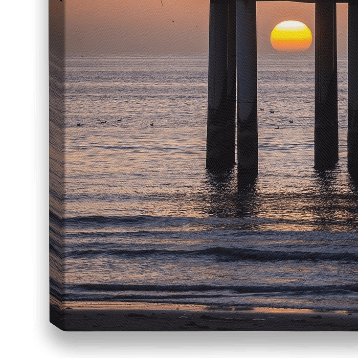 Ein schöner sommerlicher Sonnenuntergang am De Pier in Scheveningen, wo die Sonne zwischen den Pfeilern langsam im Meer versinkt.