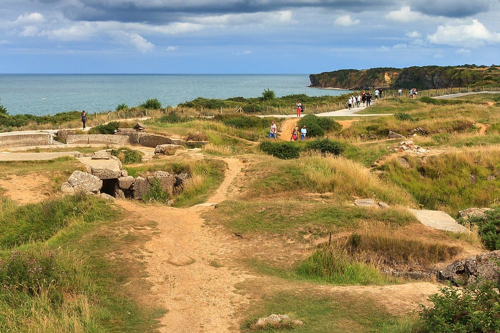 Prachtige opname van de duinen van Pointe du Hoc in Normandië, Frankrijk, tussen de stranden Omaha en Utah Beach in met WW2 bunkers en kraters op een bewolkte zomerdag