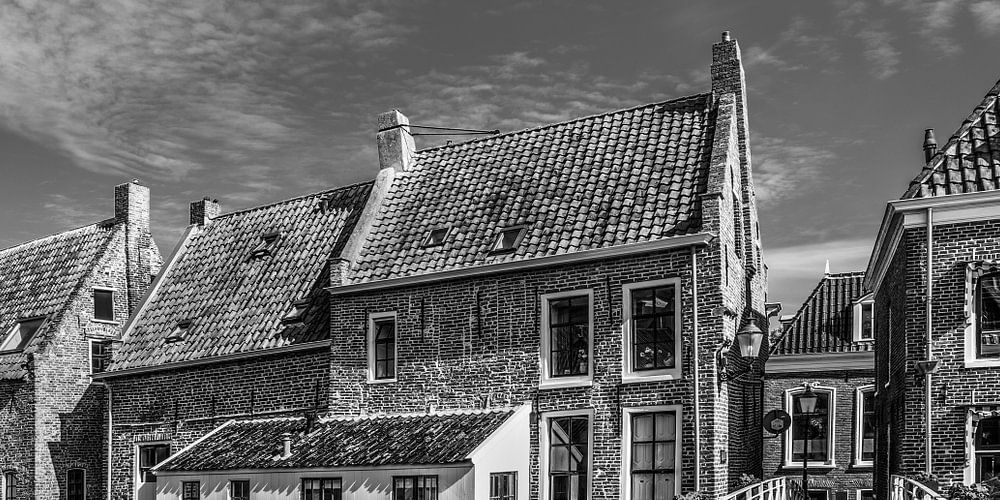 De hangende keukens in het Groningse plaatsje Appingedam in zwart/wit met brugje op de voorgrond.