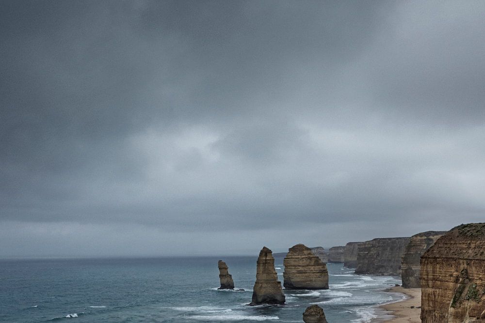 De kustlijn van het Twelve Apostles nationaal Park op een bewolkte dag