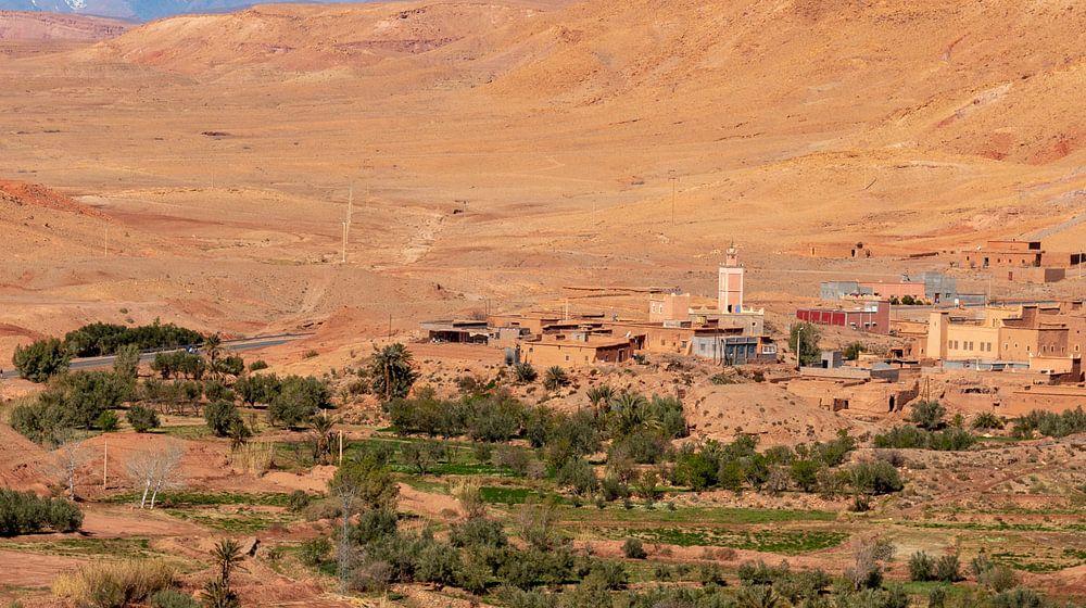 Op de voorgrond de groene oase van de laagvlakte. Op de achtergrond de sneeuw in de bergen. Marokko in het voorjaar; een heerlijke tijd om er te reizen.