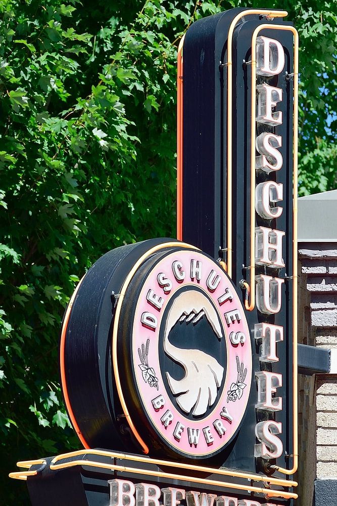 Ein großartiger Ort für Bier und einen Happen zu essen in der Stadt Portland in Oregon, USA. Die Brauerei und Gaststätte Dechutes sticht mit ihrer Beschilderung im Stil der 50er Jahre hervor.